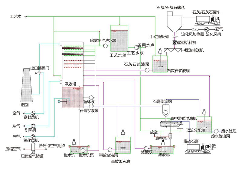 以廉價易得的石灰石或石灰作為脫硫劑,脫硫效率可達98%以上,副產的脫硫石膏可作為建材行業(如水泥廠、石膏板廠)的助劑或原料,也可作為土壤改良劑等。是技術成熟、運行可靠、應用最為廣泛的脫硫工藝,廣泛應用于各種規模的工業鍋爐和火電鍋爐。